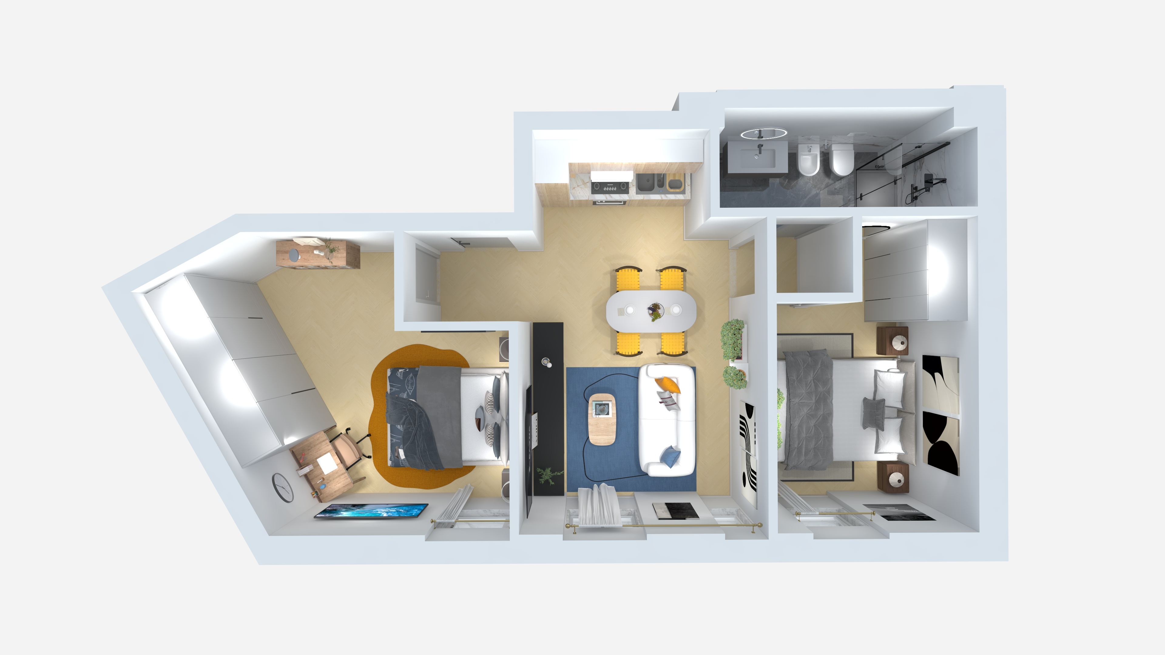 L’immobile è composto da un’accogliente zona giorno con cucina a vista che crea uno spazio aperto e conviviale, un’a’ampia camera da letto matrimoniale, una seconda camera da letto e un ampio bagno.