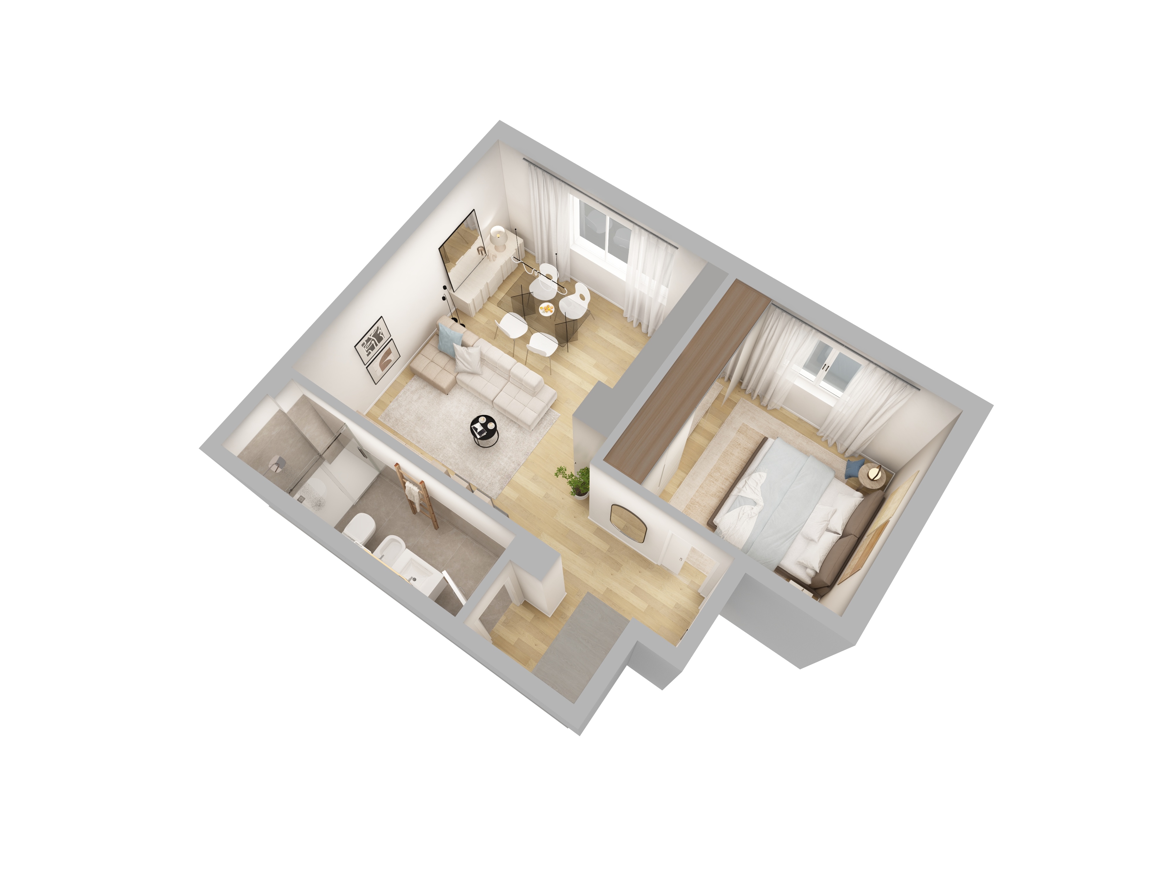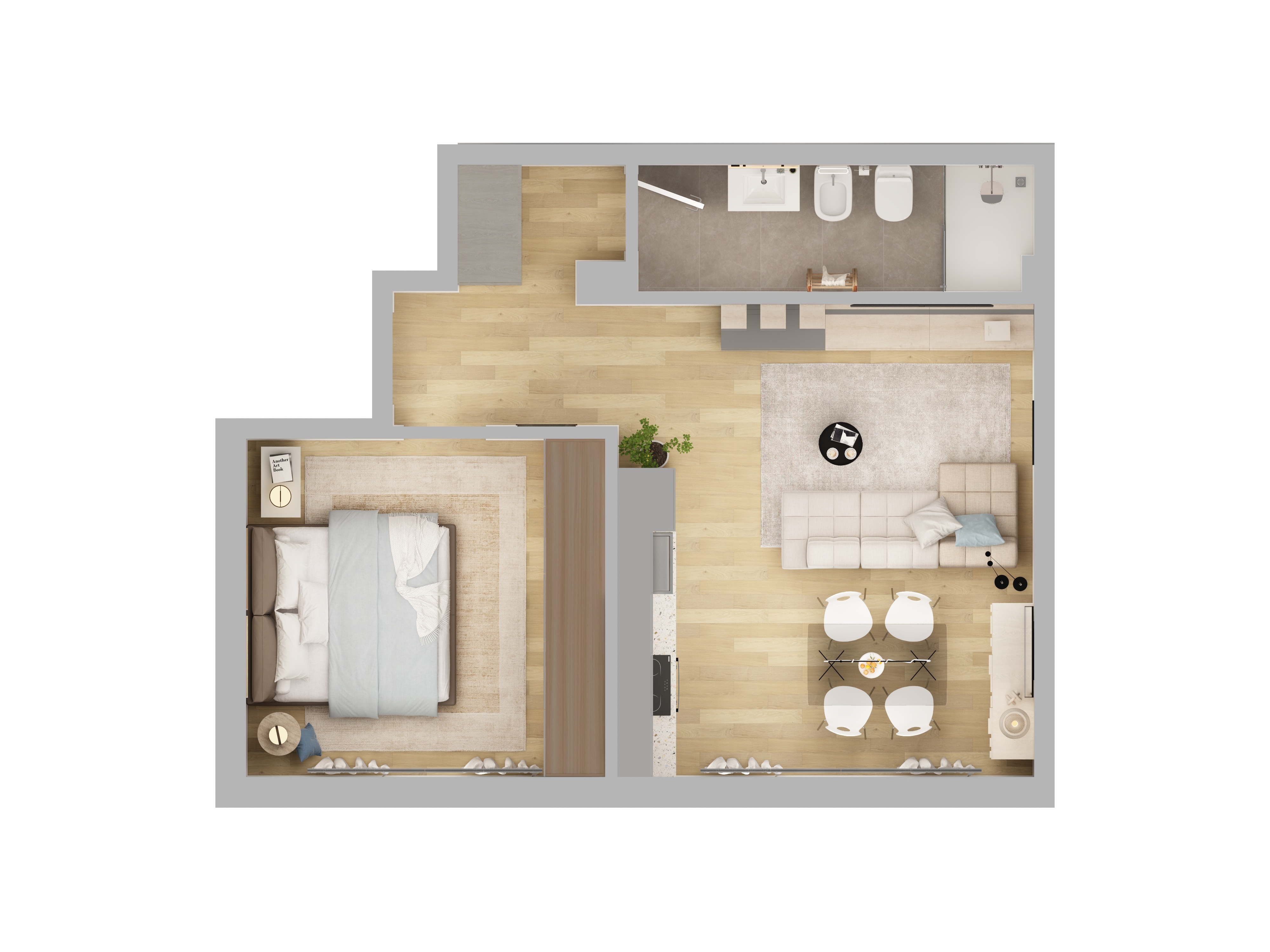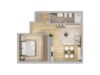 L’appartamento è composto da soggiorno con angolo cottura, ambiente funzionale e ben distribuito, camera da letto e servizio. La disposizione razionale degli spazi garantisce comfort e praticità nella vita quotidiana.