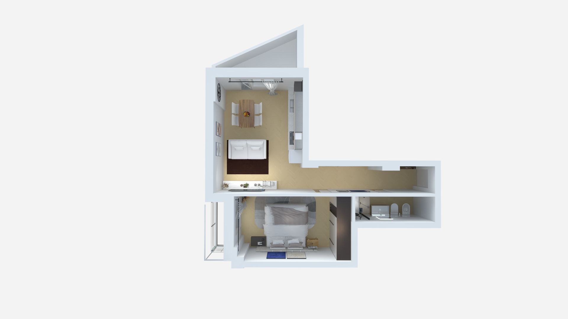 L’immobile è composto da un’accogliente zona giorno con cucina a vista che crea uno spazio aperto e conviviale, una camera da letto matrimoniale, un ampio bagno e due balconcini.