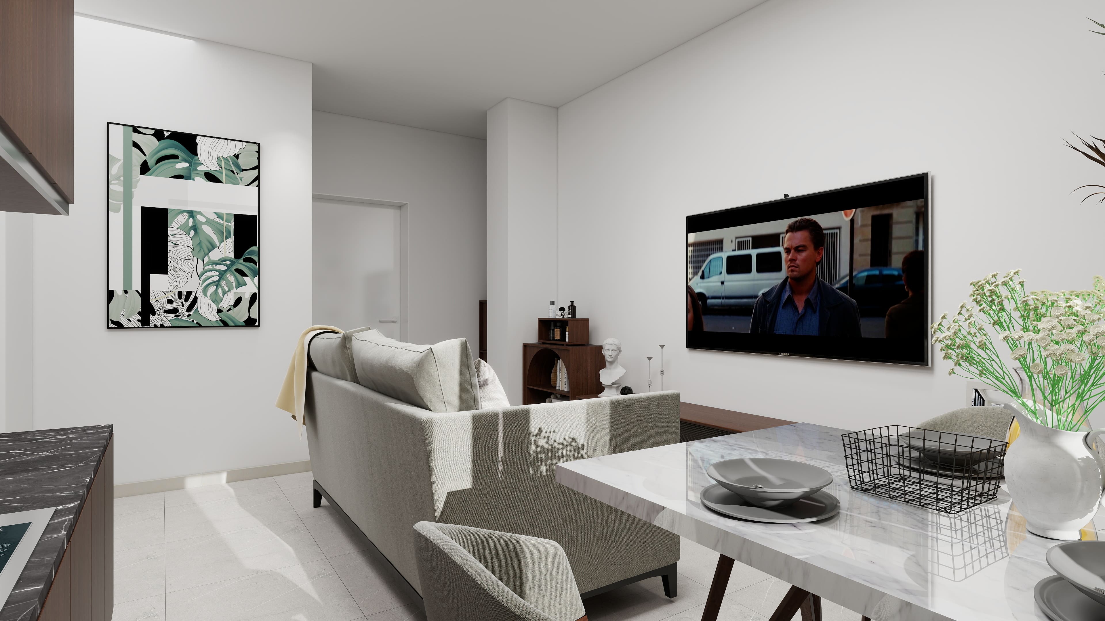 La residenza è composta da una zona living luminosa e conviviale, un bagno moderno e rifinito, due ampie camere da letto – di cui una con bagno in camera – e un comodo balconcino.