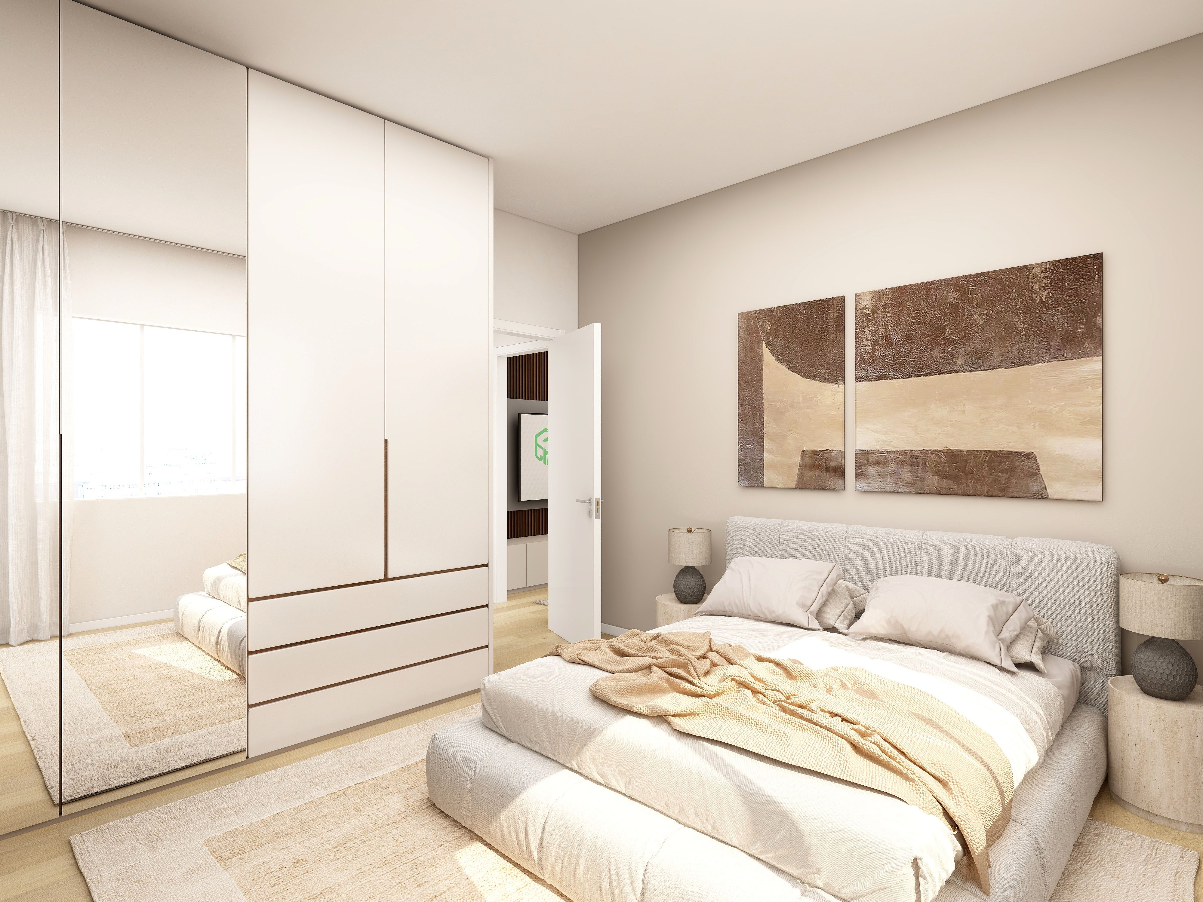 La camera da letto, tranquilla e ben proporzionata, offre anch’essa accesso diretto ad un secondo balcone.